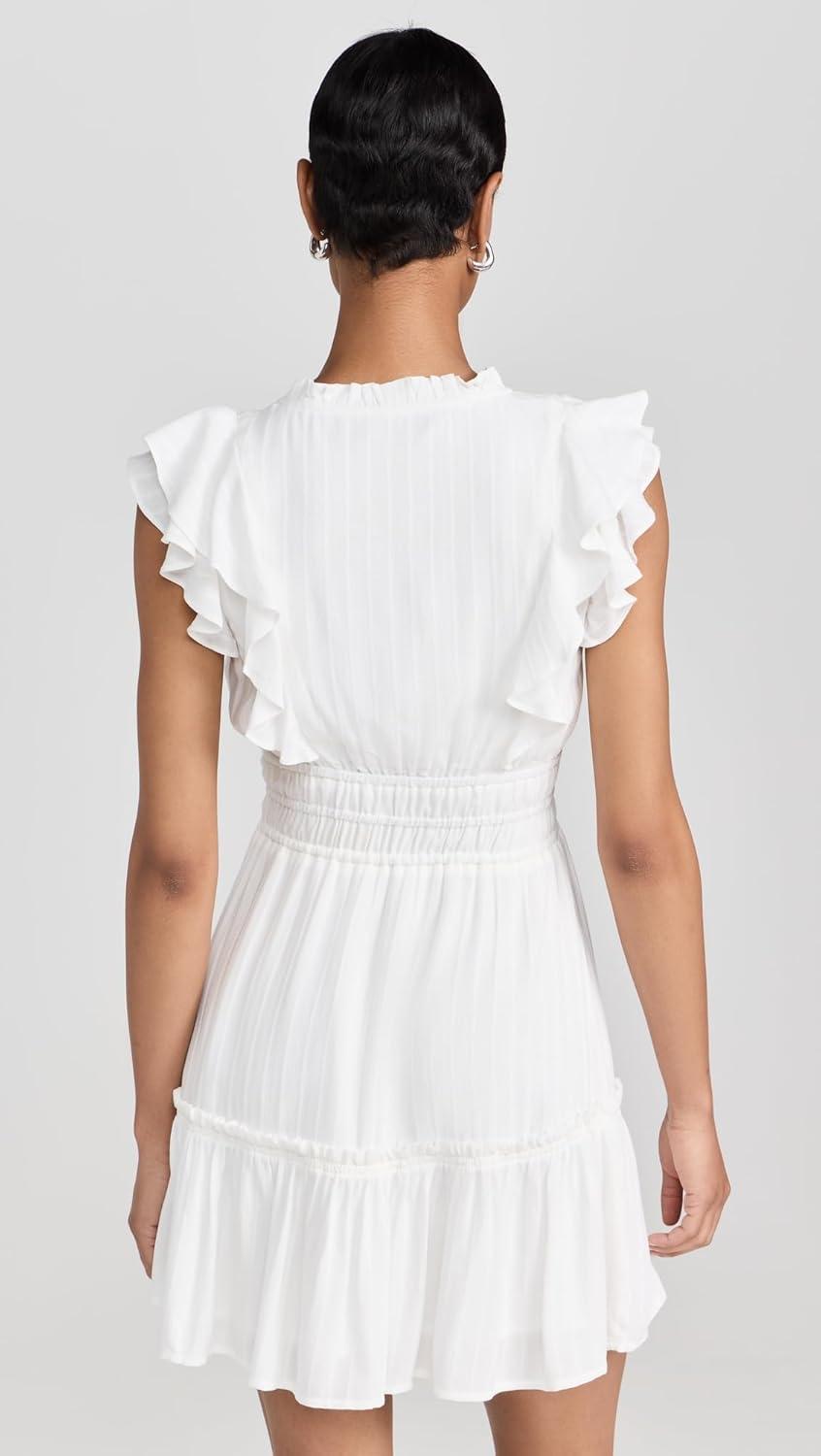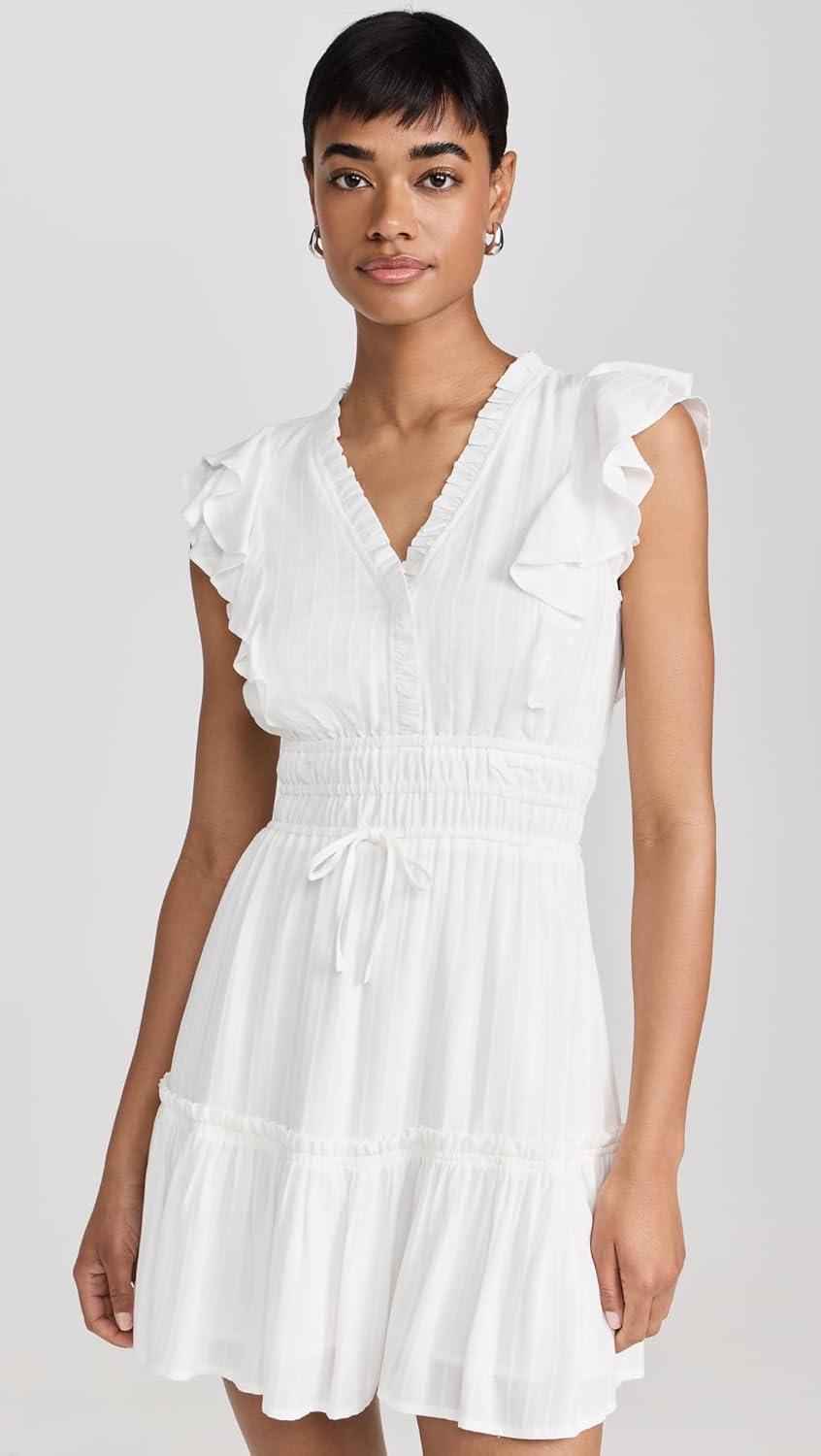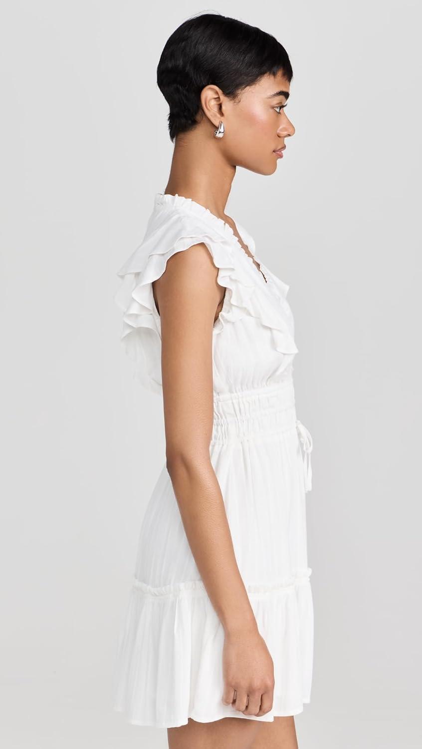 Crafted from a light and airy textured rayon material in black, this short sleeve mini dress has ruffles at the sleeves and neckline, an elastic waist with a tie detail, and a tiered skirt. Pair the Muriel Dress with sandals during the day and heels at night for an effortlessly chic look.